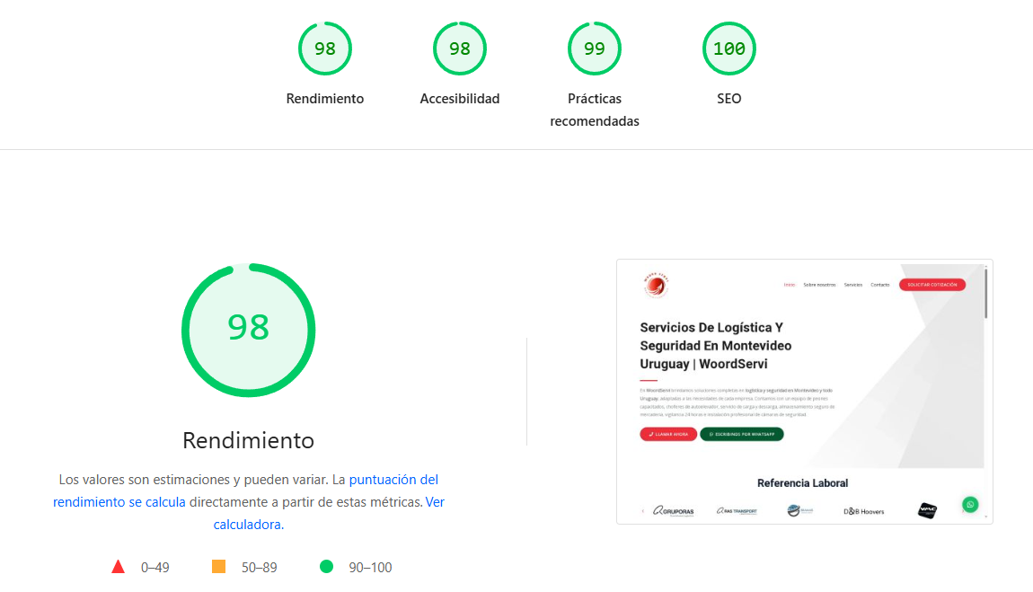 Cada proyecto que desarrollo está pensado para ofrecer velocidad, accesibilidad y visibilidad en buscadores. Mis sitios web alcanzan puntuaciones cercanas al 100% en: